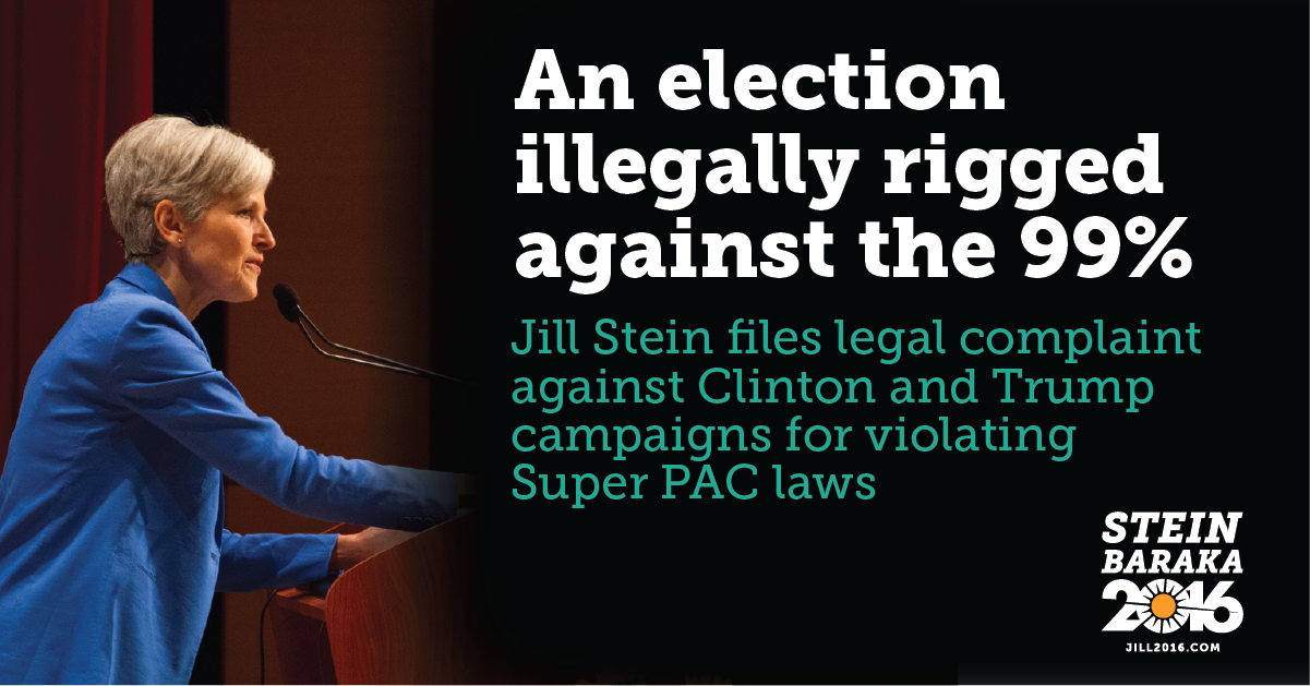 Today Green Party Presidential candidate Jill Stein filed a legal complaint before the Federal Election Commission against Hillary Clinton and Donald Trump’s presidential campaigns for having illegally coordinated with Super PACs in violation of campaign finance laws.